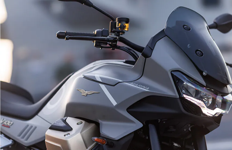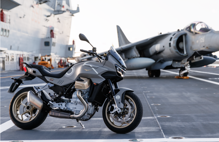 The Moto Guzzi V100 Mandello Aviazione Navale, inspired by the F-35B fighter jet, features graphics that recall the aircraft, the Marina insignia on both sides of the fairing and archetypal jet intake stripes. The livery also includes a faint reproduction of the tricolour rosette on the sides of the tank, the Aviazione Navale emblem and the Gruppo Aerei Imbarcati (Carrier-based Aircraft Division) logo.